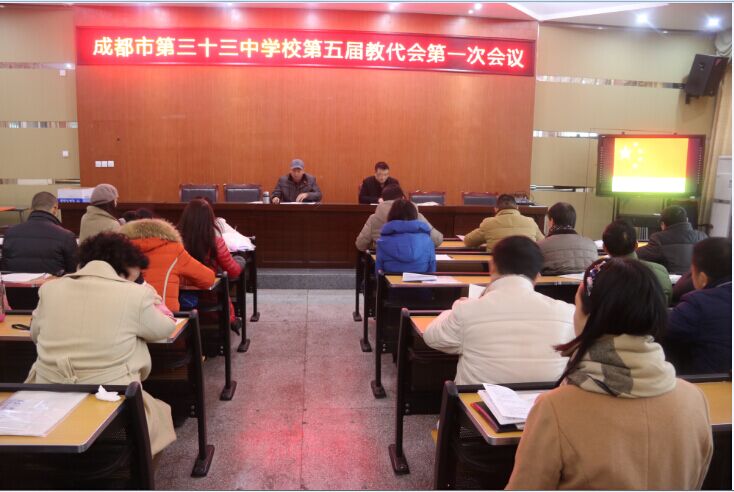 2016年1月5日下午,成都市第三十三中学校第五届教职工代表大会第一次会议在学校阶梯教室举行。共有29位正式代表及4位列席代表参加了这次会议。学校党支部书记刘燕东主持大会。