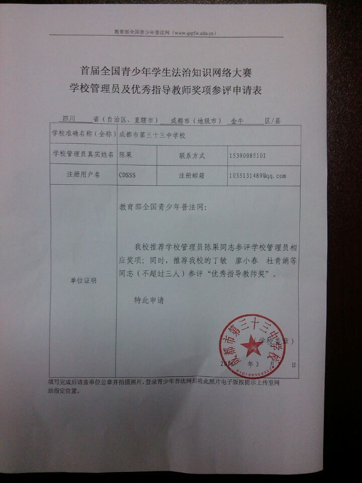由教育部主办的“首届全国青少年学生法治知识网络竞赛”(初赛)中,我校共计671名学生参赛,经过比赛角逐,635人取得进入复赛的资格。因此,我校在这次比赛活动中被评为优秀组织奖。7年级1班、7年级5班和8年级5班竞赛班级平均分位于全校各班平均分前三名,因此,丁敏、廖小春和杜青娟三位班主任老师被评为优秀指导教师。同时,陈果老师被评为校级竞赛优秀管理员。