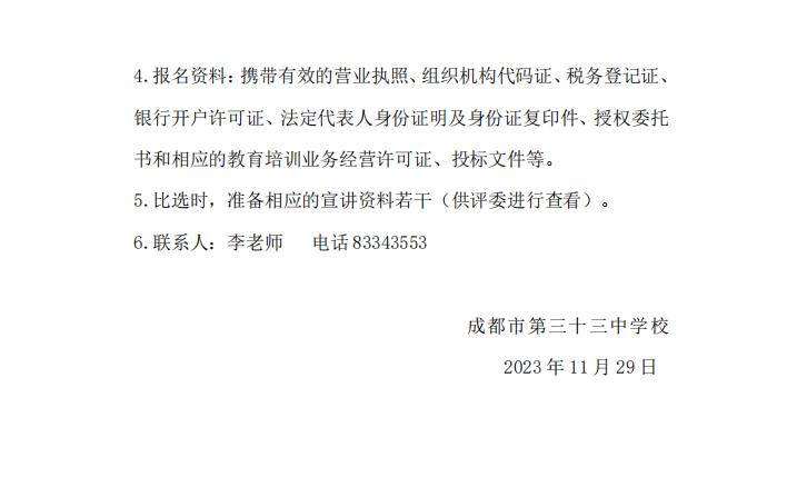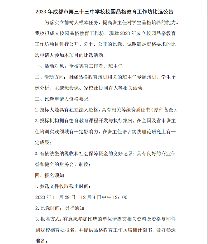 2023年成都市第三十三中学校校园品格教育工作坊比选公告