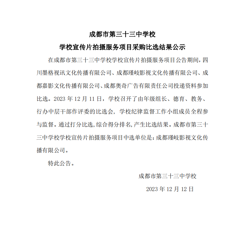 成都市第三十三中学校 学校宣传片拍摄服务项目采购比选结果公示