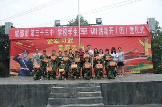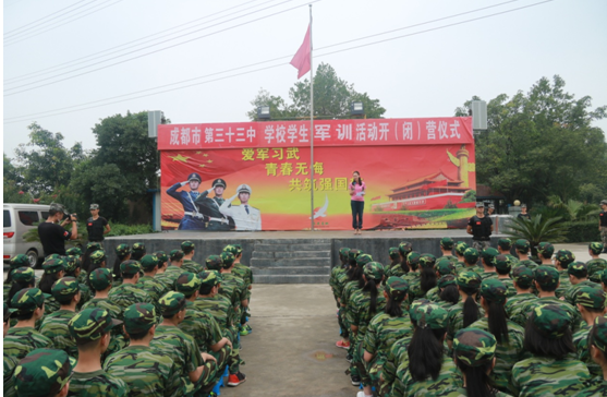军训期间,虽然烈日炎炎,但同学们在基地教官的统一指挥下,头顶骄阳烈日,始终保持积极昂扬的状态,处处展现出军人的风采。同学们吃苦耐劳,严于律已,顽强拼搏,表现出色。队伍集合,动作敏捷;站立军姿,昂首挺胸;队列训练,步伐整齐;训练场外,团结友爱。在军训汇报表演中,同学们英姿飒爽,口号嘹亮,充分展现出了成都市第三十三中学校学子的风采。雷志挺校长对同学们的高昂斗志和不怕苦不怕累的精神给予了高度评价,也对同学们以后的学习提出了明确的要求,希望同学们以这次军训为起点,珍惜青春年华,树立高远志向,发扬革命传统;希望同学们学会强身健体,学会团结合作,学会乐观自信,以健康、潇洒、自信的姿态迎接人生中新的一页。