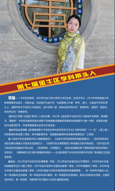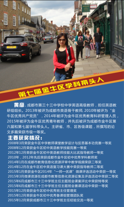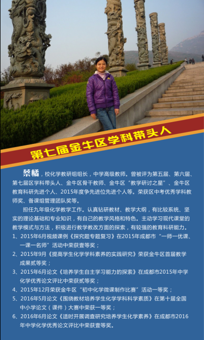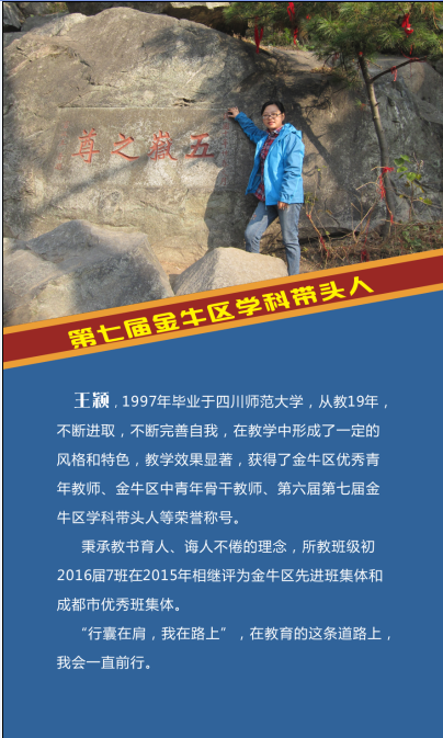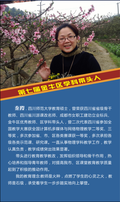 热烈祝贺我校语文教师王颖、数学教师尹晓英、英语教师黄彦、物理教师秦霞、化学教师蔡橘、历史教师徐懿和音乐教师陈果,7名教师被评为第七届金牛区学科带头人。