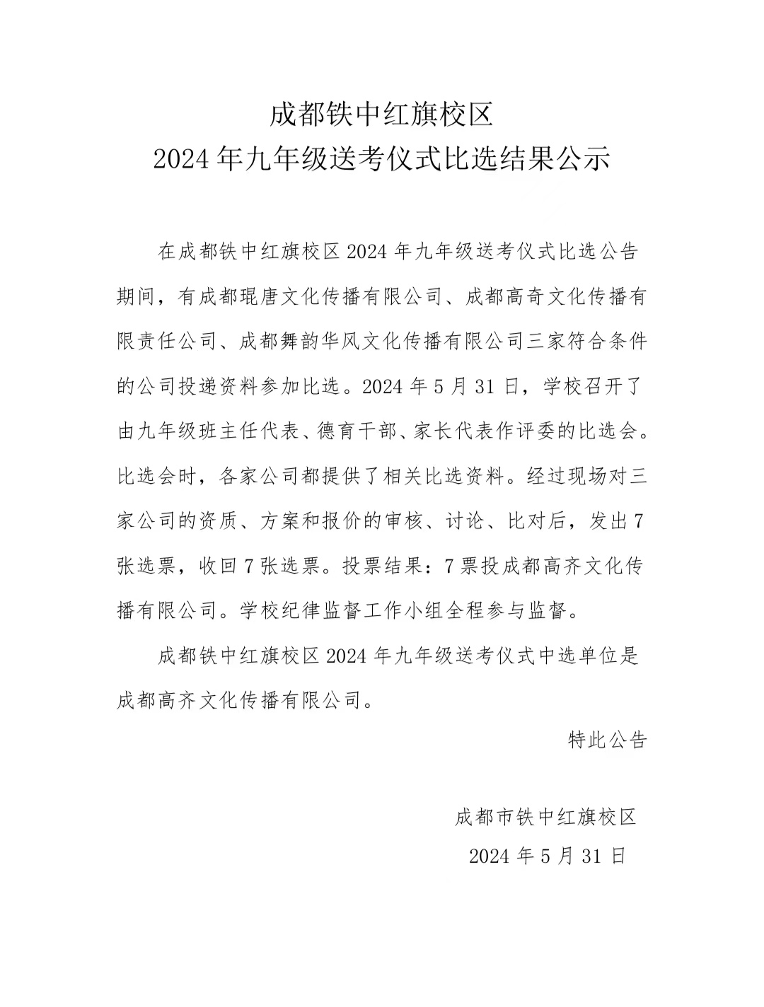 成都铁中红旗校区2024年九年级送考仪式必选结果公示
