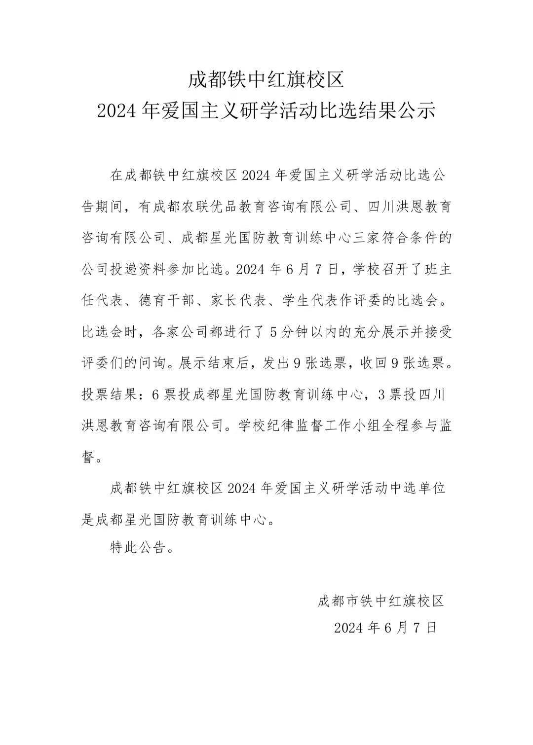 成都铁中红旗校区爱国主义研学活动比选结果公示