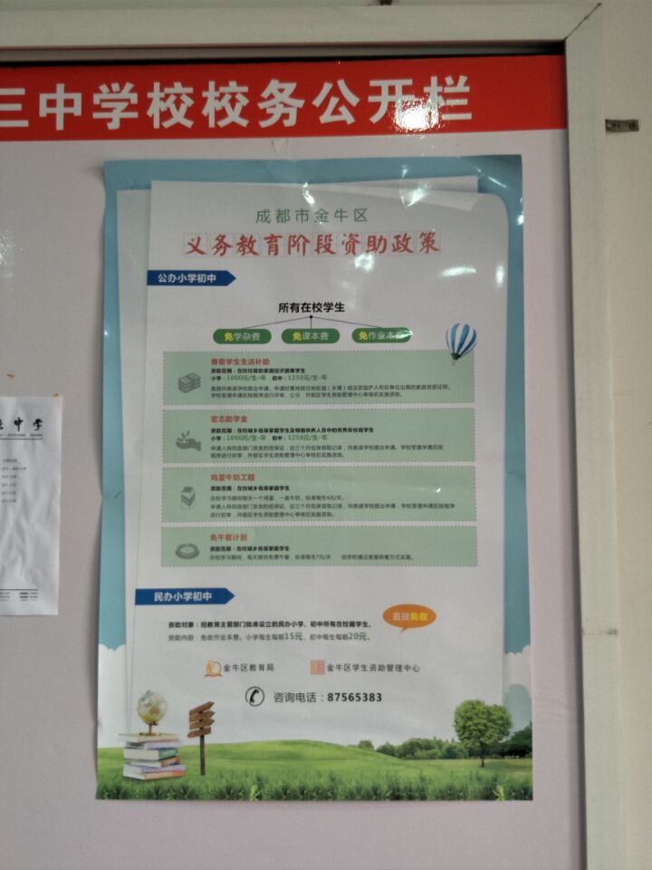 为了贯彻国家精准扶贫的政策,我校认真按照金牛区学生教育资助中心的要求,做好义务教育阶段学生教育资助政策的宣传。我校把“成都市金牛区学生教育资助政策”宣传海报,张贴在校门旁公示栏、校务公开橱窗和每个班级教室内。让全校师生了解学生教育资助政策,达到100%知晓率。为后续学生教育资助工作开展打好基础。也是对广大学生进行了一场“感恩、励志”的教育活动。