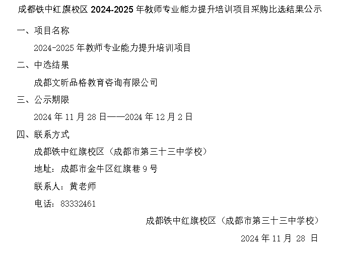 成都铁中红旗校区2024-2025年教师专业能力提升培训项目采购比选结果公示