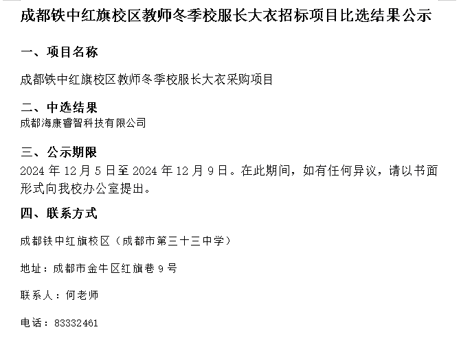 成都铁中红旗校区教师冬季校服长大衣招标项目比选结果公示