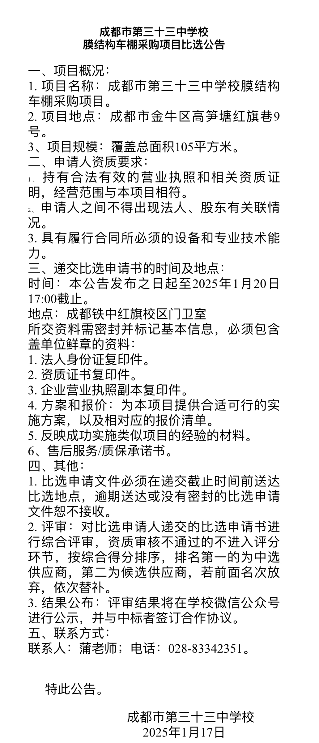 成都市第三十三中学校 膜结构车棚采购项目比选公告