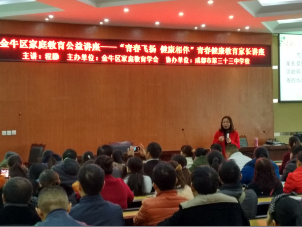 2016年11月22日,我们非常荣幸地邀请了金牛区家庭教育学会特聘讲师、青春期健康教育国家级师资、四川省性教育协会秘书长程静教授来我校,给八年级家长们做了一场题目叫《青春飞扬 健康相伴》的青春期健康家庭教育讲座。