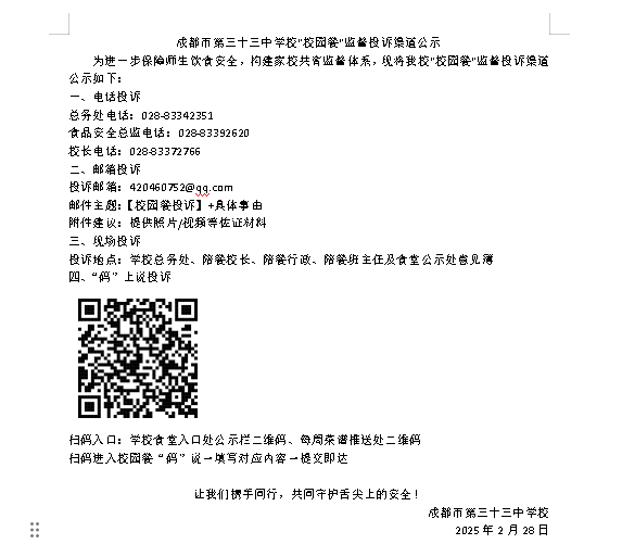 成都市第三十三中学校"校园餐"监督投诉渠道公示