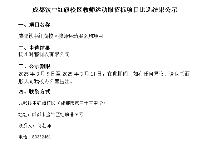 成都铁中红旗校区教师运动服招标项目比选结果公示