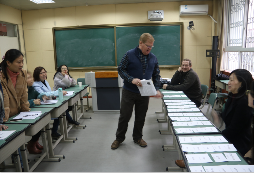除了与孩子们交流畅谈之外,英语组的老师们也获得了一对一指导的机会,两位外国朋友将游戏教学引入到了教师培训中,老师们跟着这两位外国“顽童”做起了“抢卡片”的游戏,瞬间回到了学生时代。“外教的这种游戏互动的教学方式确实非常生动,能够最大限度地激发学习者的兴趣,我们亲自体验了一把,很有意思,也值得借鉴。”学校英语教研组长黄老师这样说。