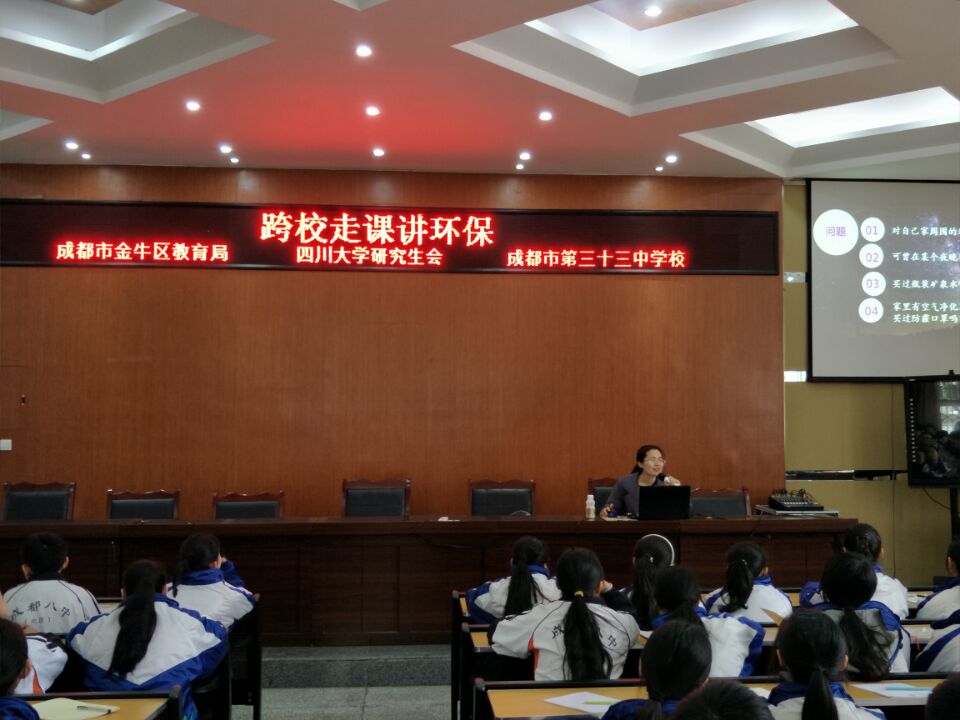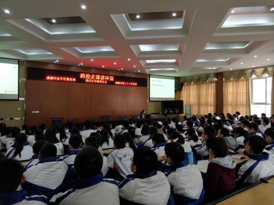 2017年3月24日上午,金牛区教育局与川大合作进行“跨校走课讲环保”活动走进33中,我校8年级学生齐聚阶梯教室,聆听了四川大学生态学博士陈娇老师主讲的“环保知识讲座”。陈娇博士面对我校初中学生,运用生动形象、丰富多彩的环保事例,深入浅出地介绍了影响世界的重大环保事件,以及对待环境保护,人类走过漫长曲折的环保治理历程。面对当今世界严峻的环保形势,每个地球公民该怎么办?唤起学生对环保关注和参与环保治理的自觉性。