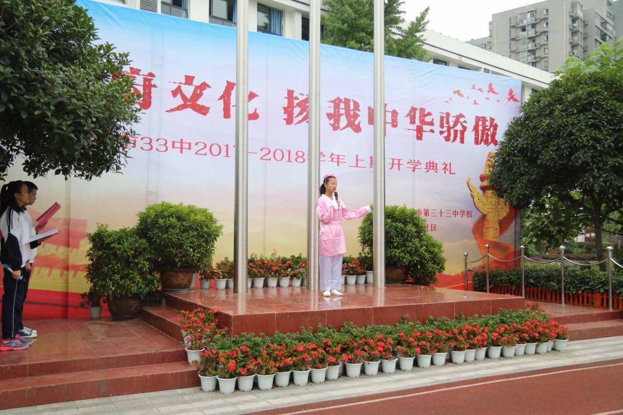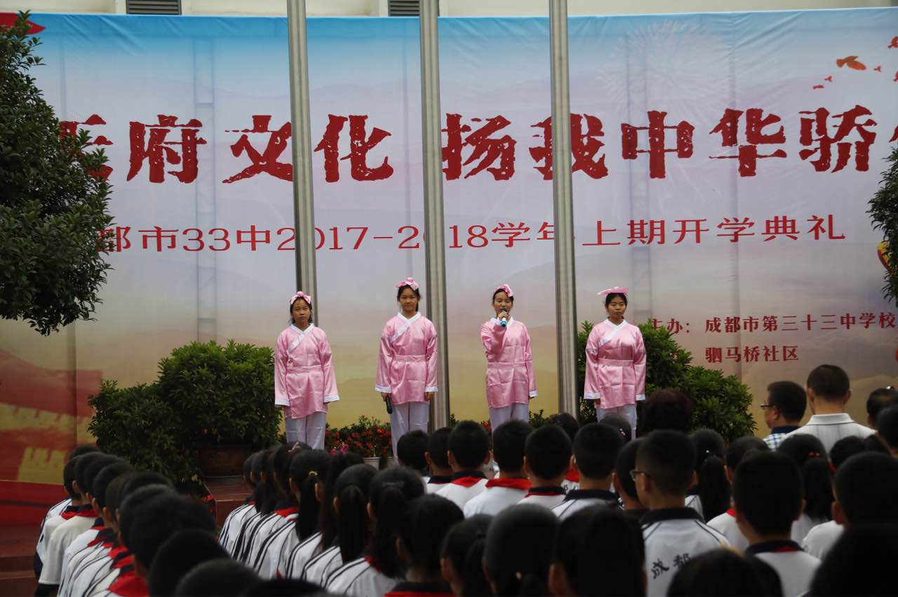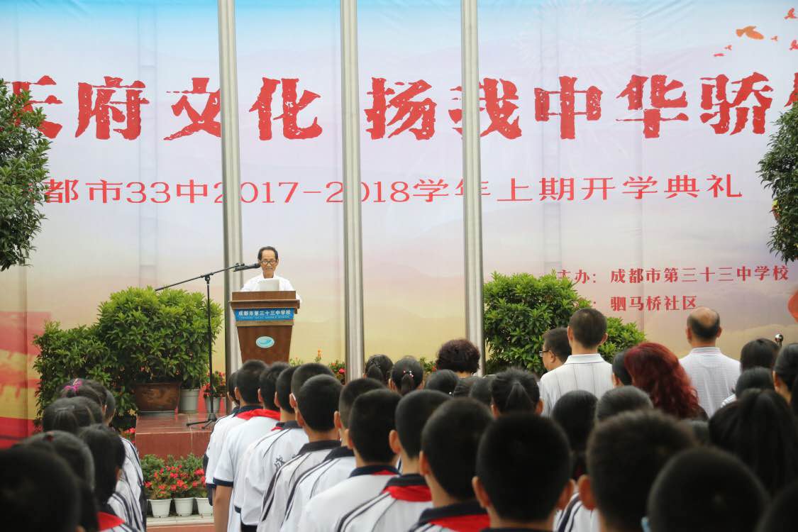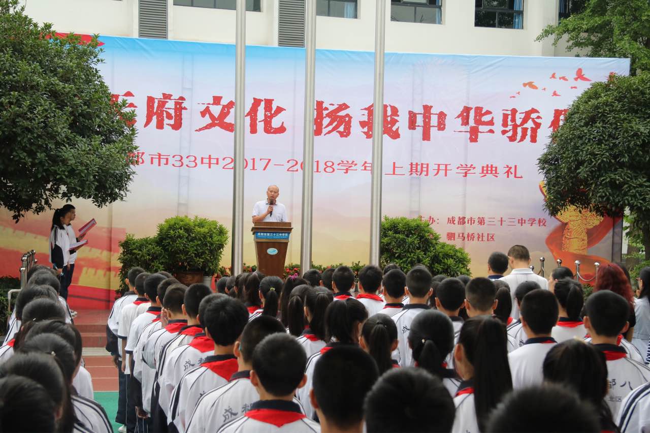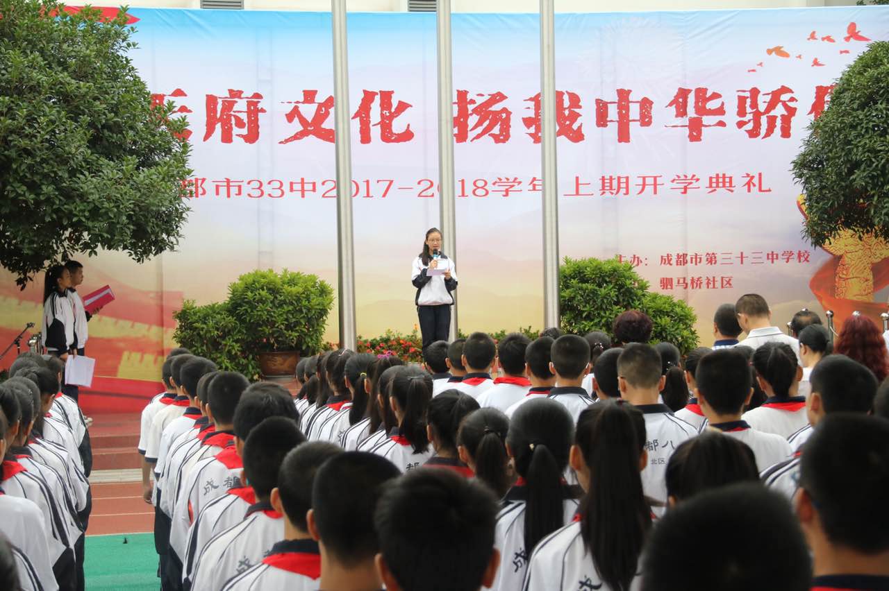 2017年9月1日上午,“传习天府文化 扬我中华骄傲”为主题的2017-2018学年上期开学典礼在焕然一新的三十三中校园如期举行,全校师生精神饱满、意气风发,以良好的精神面貌迎接新学期的到来。