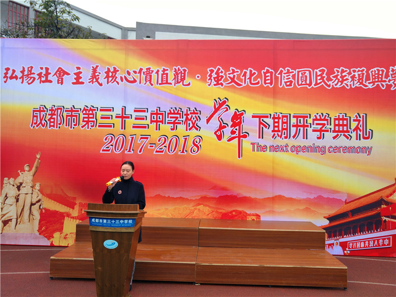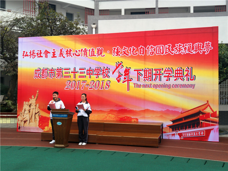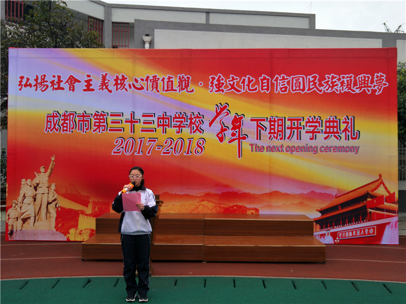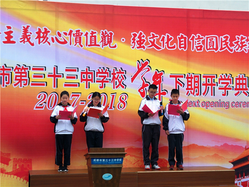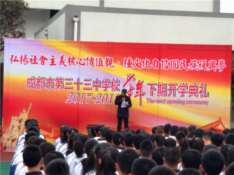 2018年3月5日上午,“弘扬社会主义核心价值观 强文化自信民族复兴梦”为主题的2017-2018学年下期开学典礼在初春的三十三中校园如期举行,全校师生精神饱满、意气风发,以良好的精神面貌迎接新学期的到来。