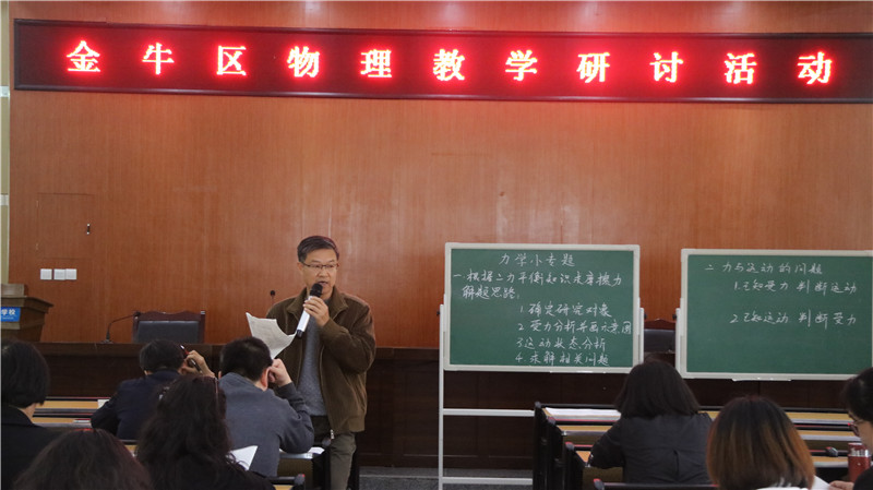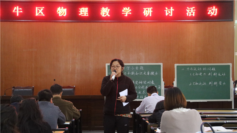 5月10日下午,金牛区初中物理教学研究活动在我校举行。我校谢秀明老师精心准备并奉献了一堂初三复习研究课《力学小专题》。教研员李跃旗老师组织区内物理教师评课研讨。我校物理教研组长秦霞老师针对初三物理合格率如何抓进行了专题发言。
