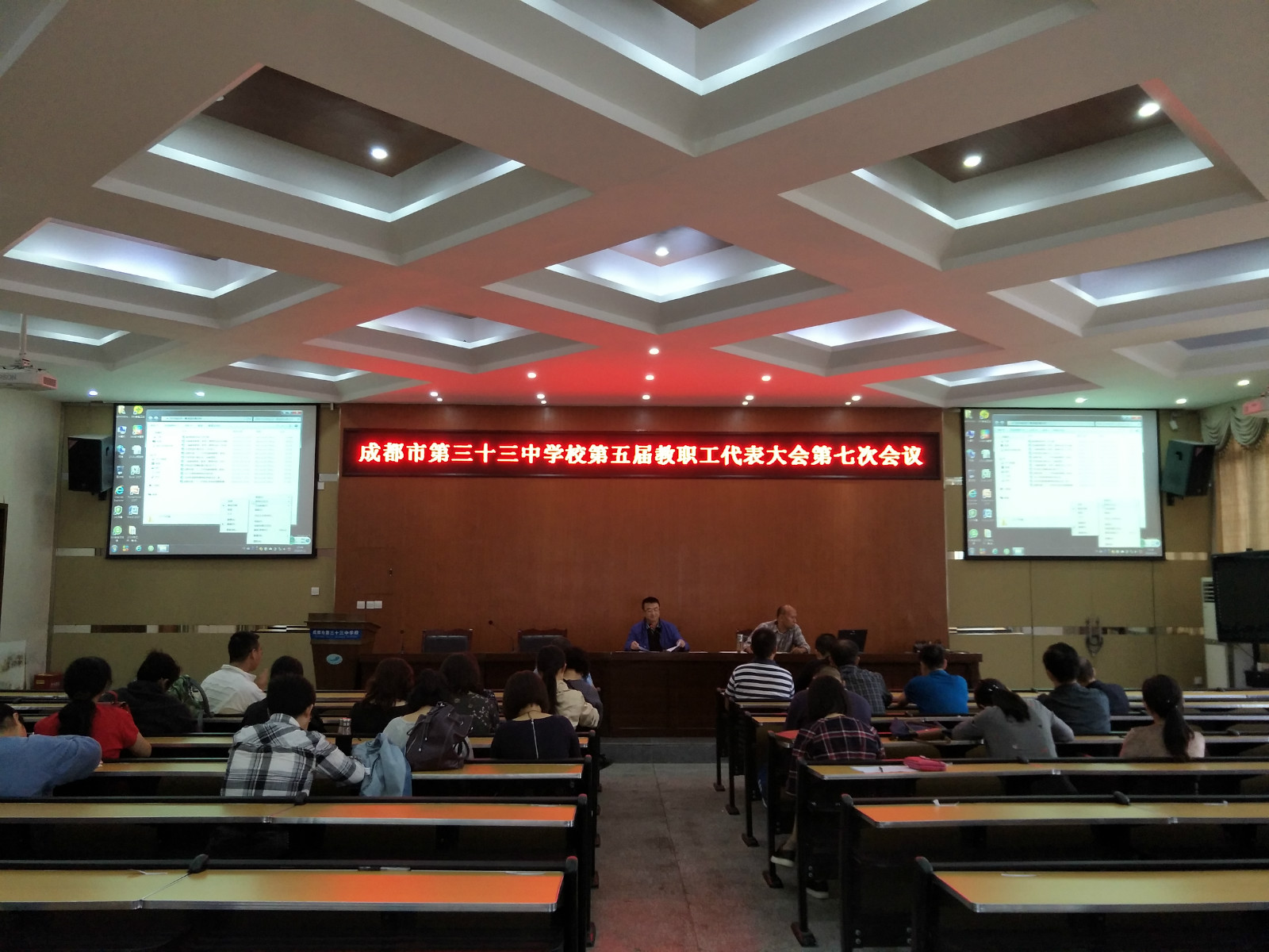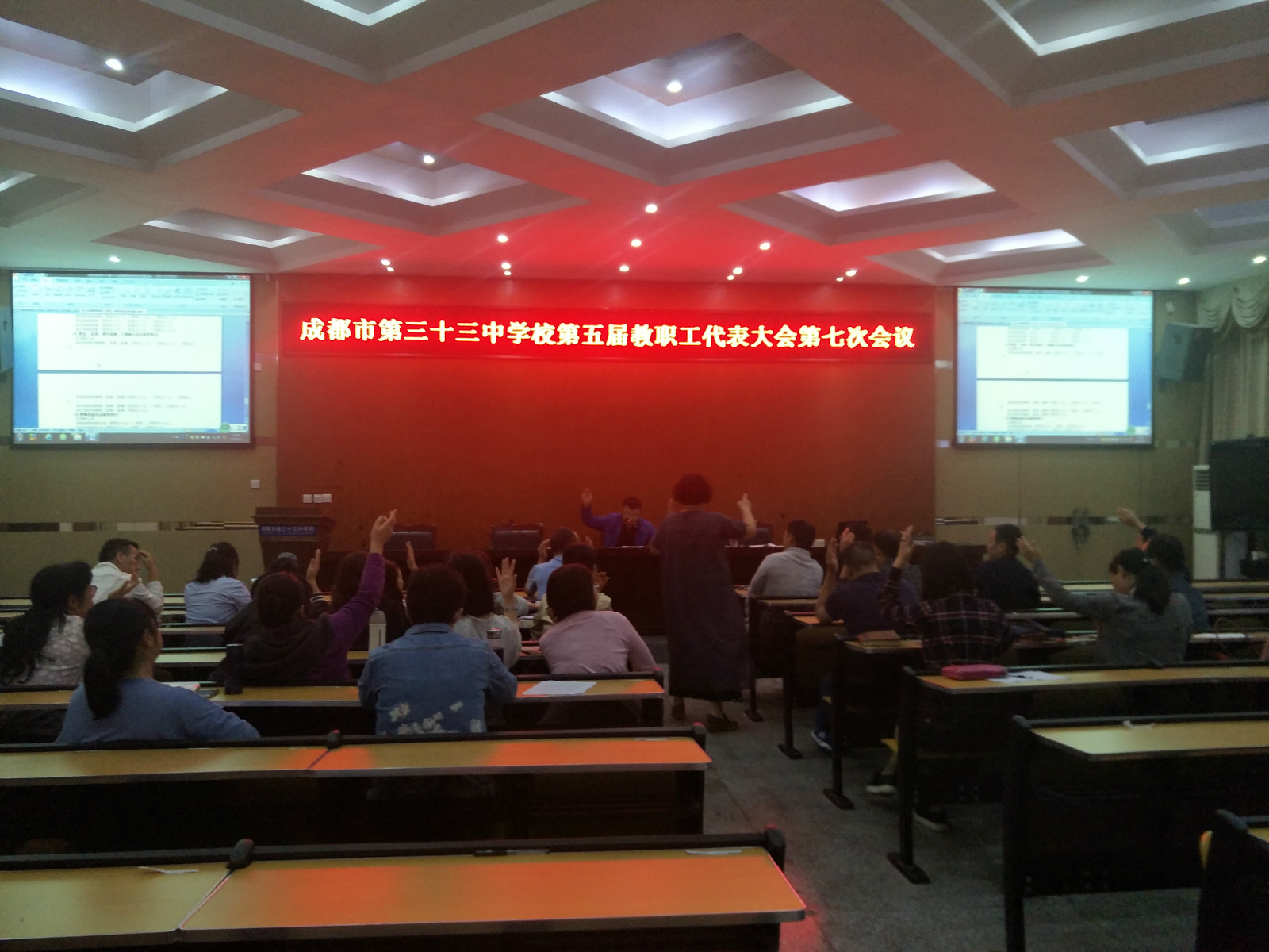 成都市第三十三中学校于2018年9月13日下午5:30在阶梯教室组织召开了第五届教职工代表大会第七次会议。会议由刘燕东书记主持,会上,教代会主席秘书长刘琳莉作了《提案工作报告》,雷志挺校长就《成都市第三十三中学校一级教师职称(职务)推荐办法》、《成都市第三十三中学校高级教师职称(职务)推荐办法》和《成都市第三十三中学校年度奖励经费分配办法》《岗位竞聘实施方案》进行了说明,然后交全体代表讨论,经过讨论,全体代表一致通过了以上三个办法。此次会议圆满完成了预定的任务,是我校教职工充分发扬民主、参与学校管理的具体体现,教代会的成功召开,必将推动学校民主管理工作的进一步开展,促进学校教育教学工作的顺利进行。