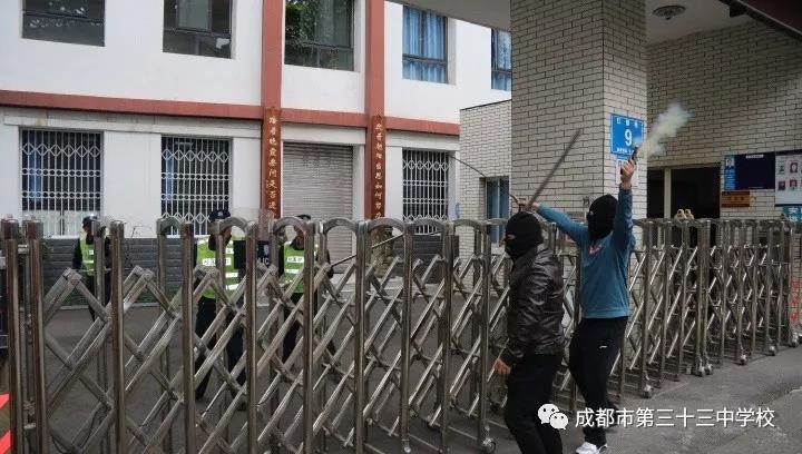 校园各处安保人员和老师手持,盾牌、钢叉、长棍等防护器材,第一时间从各个门岗赶到现场,采用战术配合、多人配合,与“暴徒”展开搏斗。
