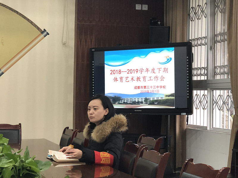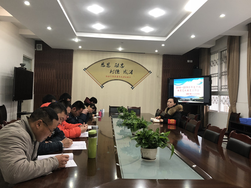 2019年3月1日上午,我校召开2018-2019学年度下期艺体工作会。体育组、艺术组全体教师和学校德体卫艺办公室主任和干事参会。 分管艺体工作的陈晓静副校长在会上总结了上学年我校艺体工作取得的成绩,同时对新学期艺体工作进行了安排部署。艺术组教研组长何端和体育组教研组长桑伟,分别对本期艺术和体育工作进行了具体的计划安排。