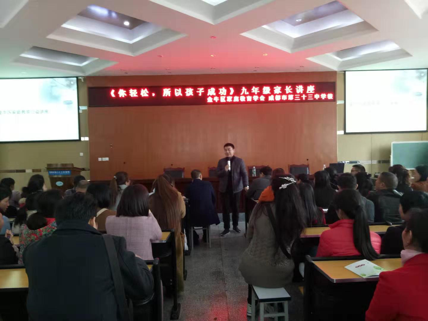 2019年03月12日下午两点,我校在阶梯教室举行九年级家长培训讲座。本次活动由金牛区家庭教育协会