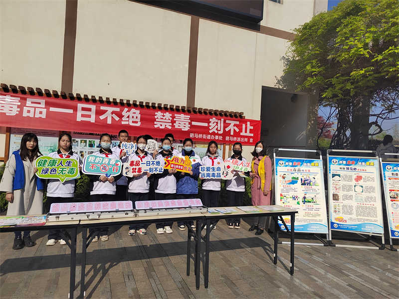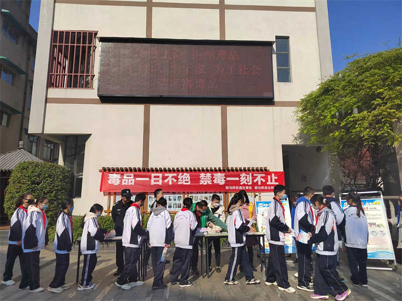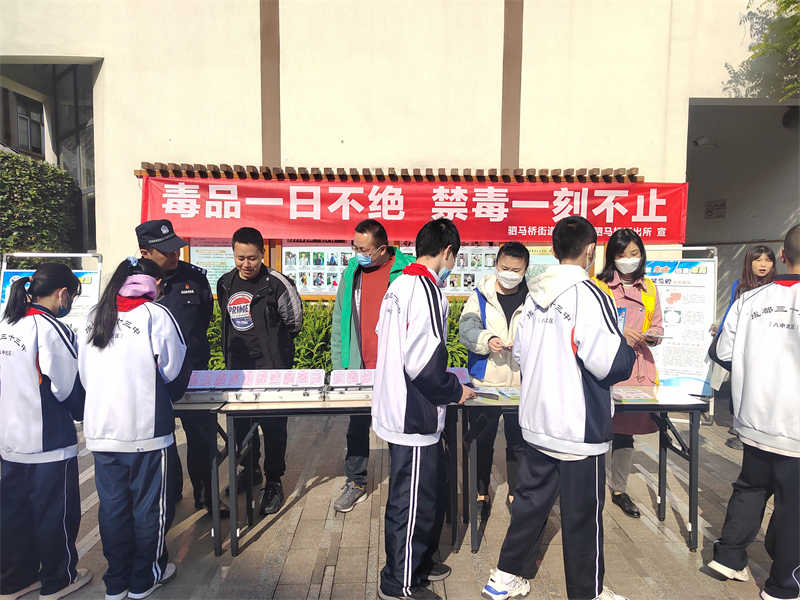 为切实加大禁毒宣传力度,让广大青少年认清毒品的危害,进一步增强防毒、拒毒意识和相关法律知识,深入发挥学校在毒品预防教育活动中的重要作用,驷马桥街道联合驷马桥派出所于2023年3月29日,在成都三十三中学开展了主题为“毒品一日不绝、禁毒一刻不止”禁毒宣传教育活动。街道、派出所、学校领导、学生、禁毒专干及禁毒社工共计600余人参加了此次活动。