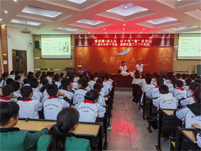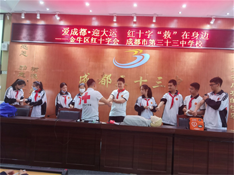 为纪念5.8红十字日和5.12防灾减灾日,弘扬“人道、博爱、奉献”的红十字精神;进一步推进红十字应急救护知识的传播和普及,提高校园师生的自救互救和自我保护能力。5月8日,金牛区红会到成都市第三十三中学校开展应救护普及培训活动。