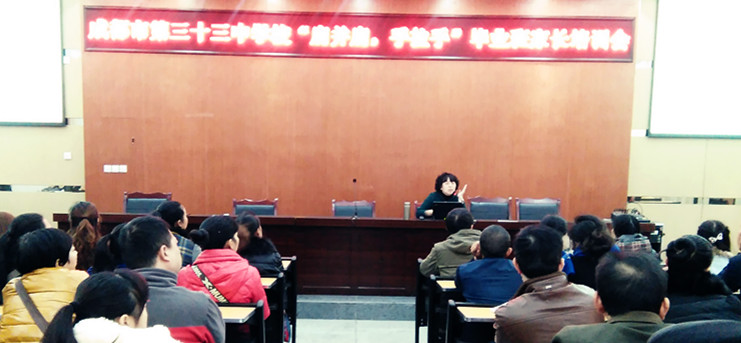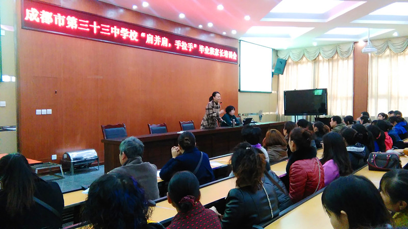 11月26日下午四点,学校阶梯教室座无虚席,这里正在召开主题为“肩并肩,手拉手”初三家长专题培训会,这也是成都市第三十三中学校家庭教育大讲坛系列活动之一。本次讲座由年级组长刘琳莉老师主讲,德育副校长陈晓静出席并主持了本场讲座。