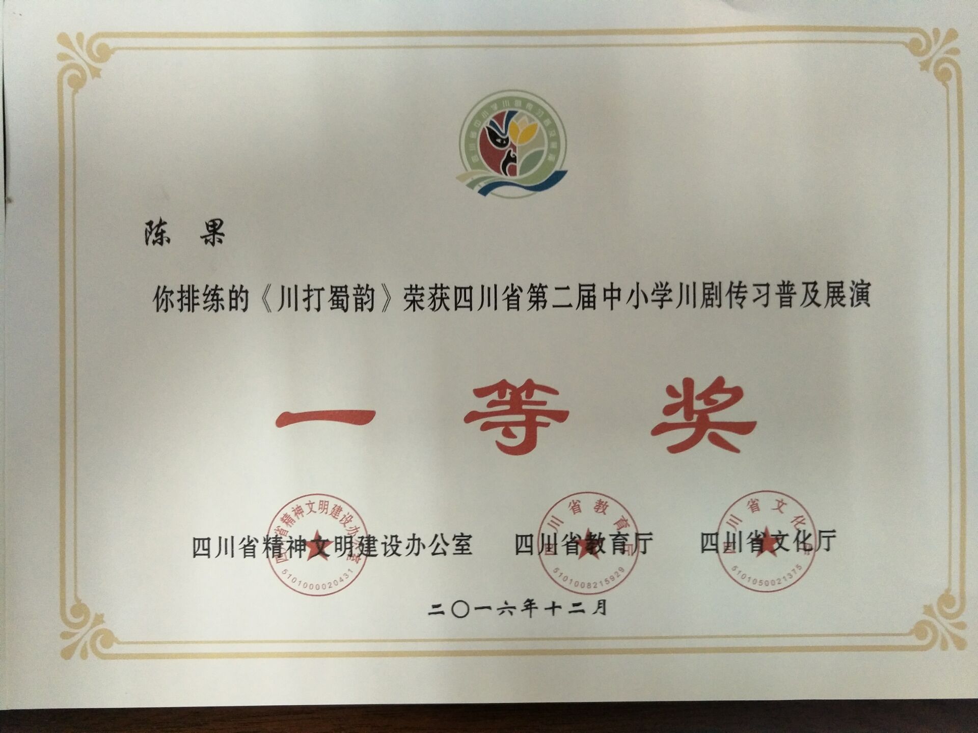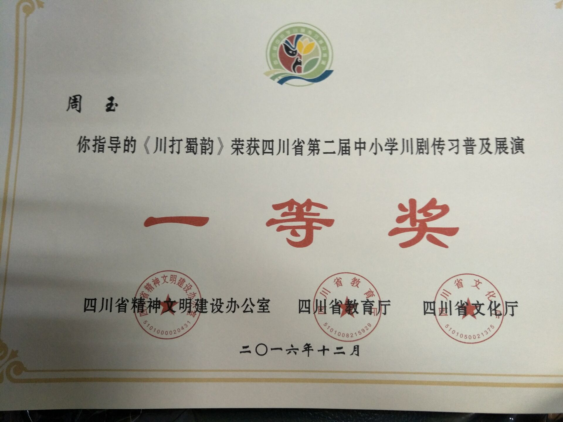 我校川剧节目《川打蜀韵》在由四川省精神文明办公室、四川省教育厅、四川省文化厅联合主办的“四川省第二届中小学川剧传习普及展演”活动中,荣获一等奖。我校陈果老师和成都市川剧研究院周玉老师荣获排练指导教师奖。