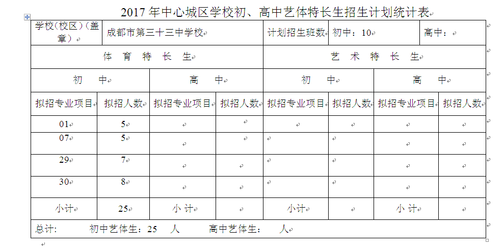 2017年中心城区学校初、高中艺体特长生招生计划统计表