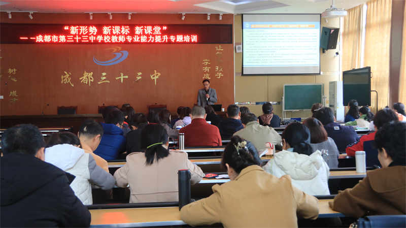 春华秋实绘佳卷,乘风远航启新程。为促进教师专业化发展,努力建设一支师德修养高、业务素质精良、教学技能全面的教师队伍,成都市第三十三中学校于2023年3月28日下午,开展了主题为“新形势 新课标 新课堂”的教师专业能力提升培训活动。