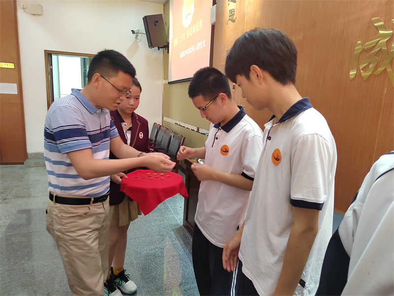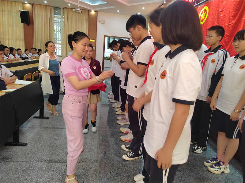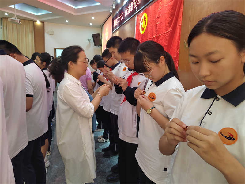 佩戴在团员左胸前的团徽,是一个代表共青团的徽章,它不是一个普通的装饰品,也不是一般的纪念章,而是共青团肩负重任的标志,由贾拥洪副校长,德育处李坤霖副主任,学校团委书记杨萍老师为新团员佩戴团徽