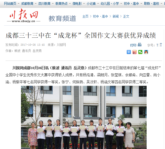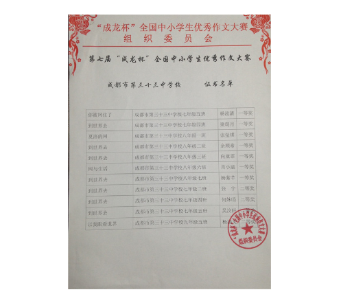 成都三十三中在“成龙杯”全国作文大赛获优异成绩