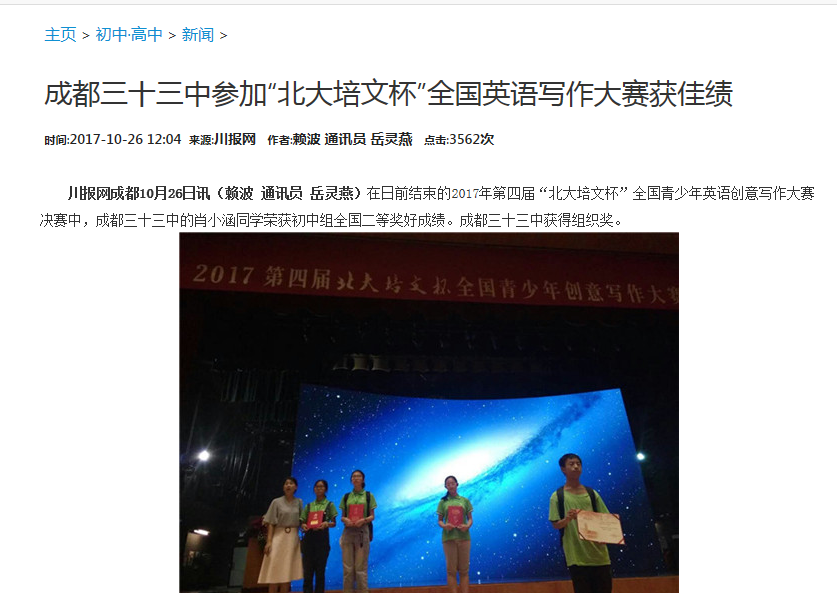 成都三十三中参加“北大培文杯”全国英语写作大赛中获佳绩