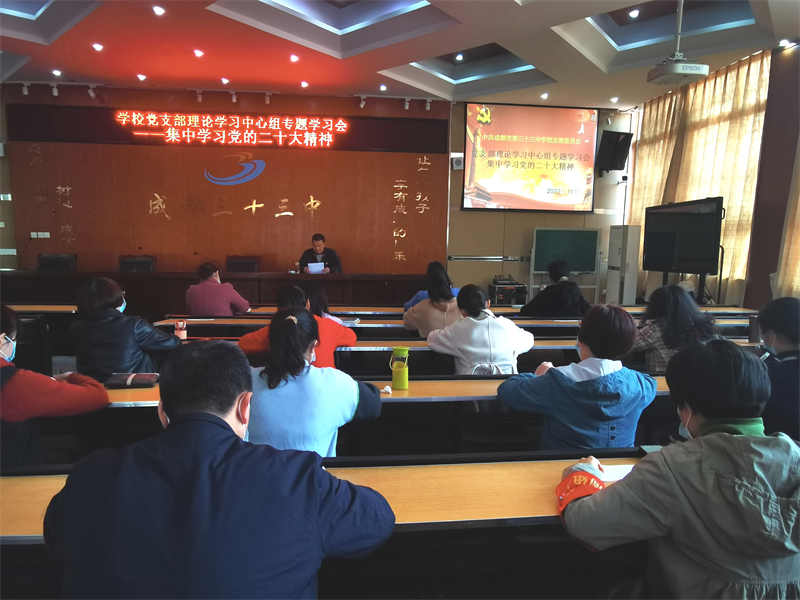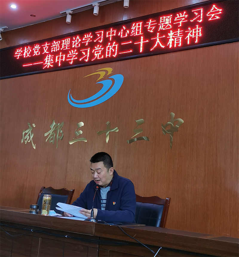 2022年11月22日,成都市第三十三中学校党支部开展“学精神、悟思想、担使命、践行动”主题党日活动,集中学习党的二十大精神。书记、校长吴雪峰同志主持会议并带头谈认识体会。他指出,学深悟透党的二十大精神是一个不断深化的过程,要在全面学习、全面把握、全面落实上下功夫,深刻领悟“两个确立”的决定性意义,牢牢把握习近平新时代中国特色社会主义思想的丰富内涵和核心要义,牢牢把握中国式现代化的本质要求,进一步强化担当意识、积极主动作为、凝聚奋进合力,扎实推动党的二十大精神在我校落地见效。