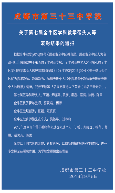发表时间:2016-9-9 15:49:07 来源:成都市第三十三中学校 编辑:成都铁中红旗校区