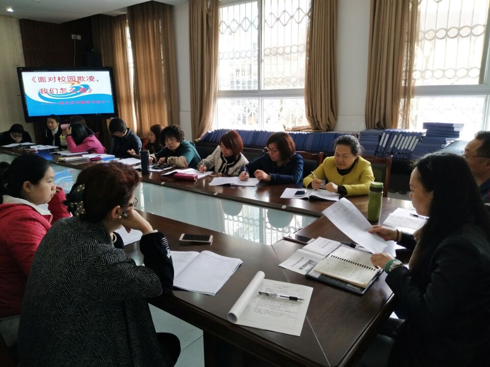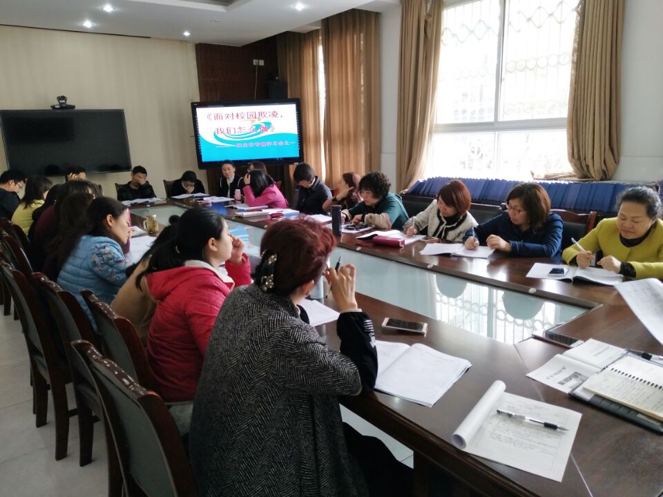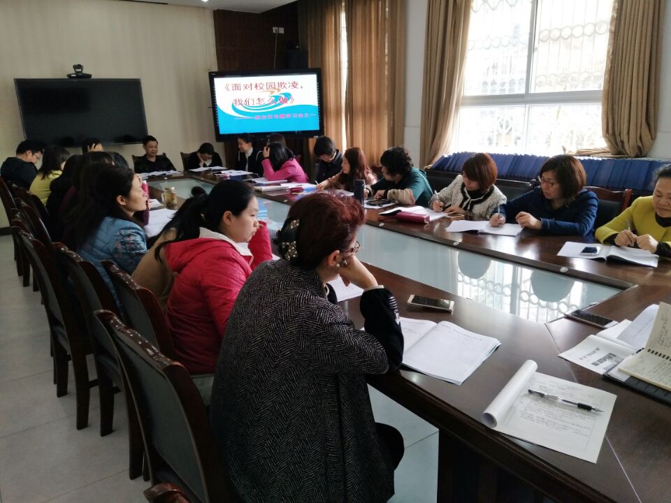 针对某些校园内发生的“以暴制暴”、“以多欺少”、“勒索财物”等事件,为了提高我校班主任队伍的法制意识、普及法律知识,2017年4月5日下午,利用班主任例会时间,对全校班主任进行了《面对校园欺凌我们该怎么做》的专题培训活动。培训活动上结合诸多案例,分析了什么是校园欺凌,校园欺凌行为产生的原因,欺凌对象有哪些?更重要的是如何应对和减少校园欺凌。班主任们认真倾听,仔细做笔记,积极参与互动。