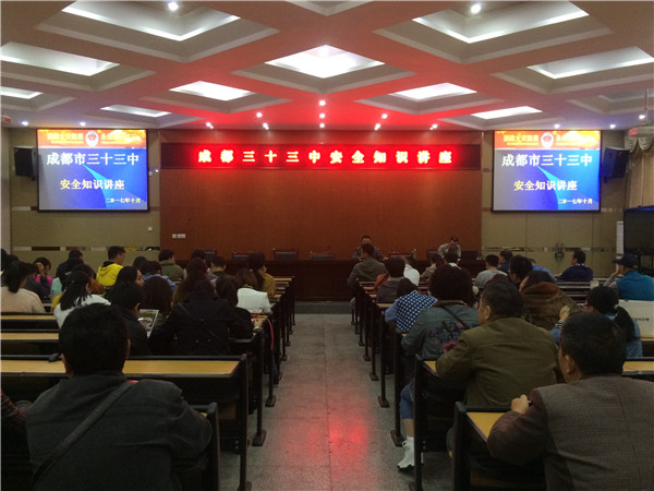 2017年10月17日下午,全校教职员工以及后勤人员齐聚阶梯教室参加由成都市防火办公室承办的成都三十三中安全知识讲座,主讲人成都市首席教官周金贤。