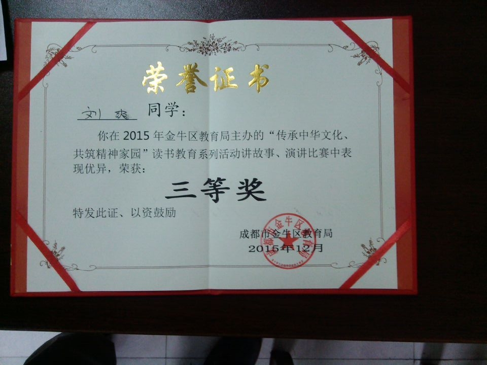 我校学生刘爽荣获金牛区演讲比赛三等奖