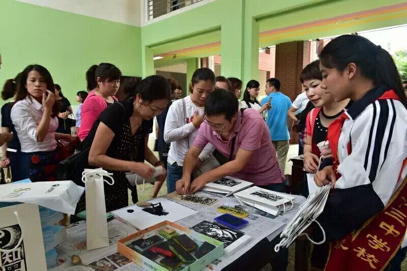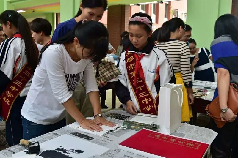 2016年9月6日下午,金牛区教育局教师节庆祝大会在7中万达学校隆重举行。我校受大会之邀,版画作品在大会进行展示。在会场展览区,我校版画作品分外惹人关注,大家驻足观看作品,亲自体验版画的创作,33中展区人气爆棚。大家开心地玩起“盖章”游戏,提着自己DIY的版画纸袋,开心极了。