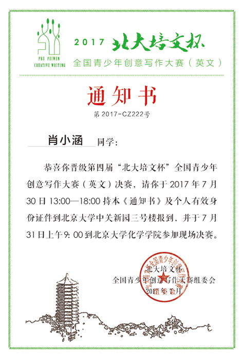 热烈祝贺我校八年级肖小涵同学在第四届“北大培文杯”全国青少年创意写作大赛(英文)中,成功晋级决赛,成为全国初中组八强。
