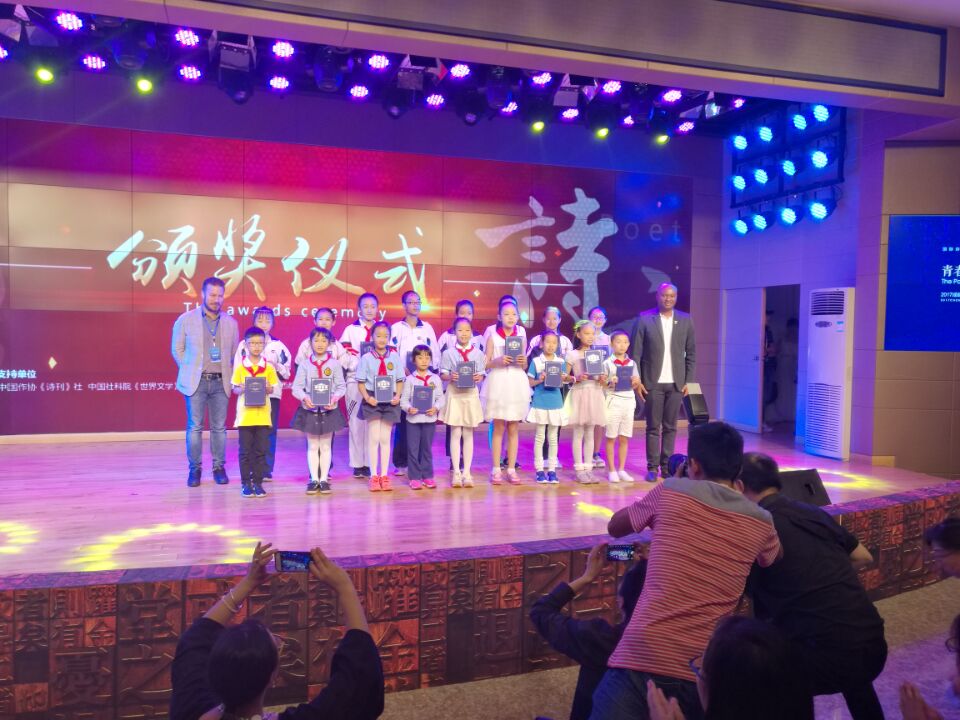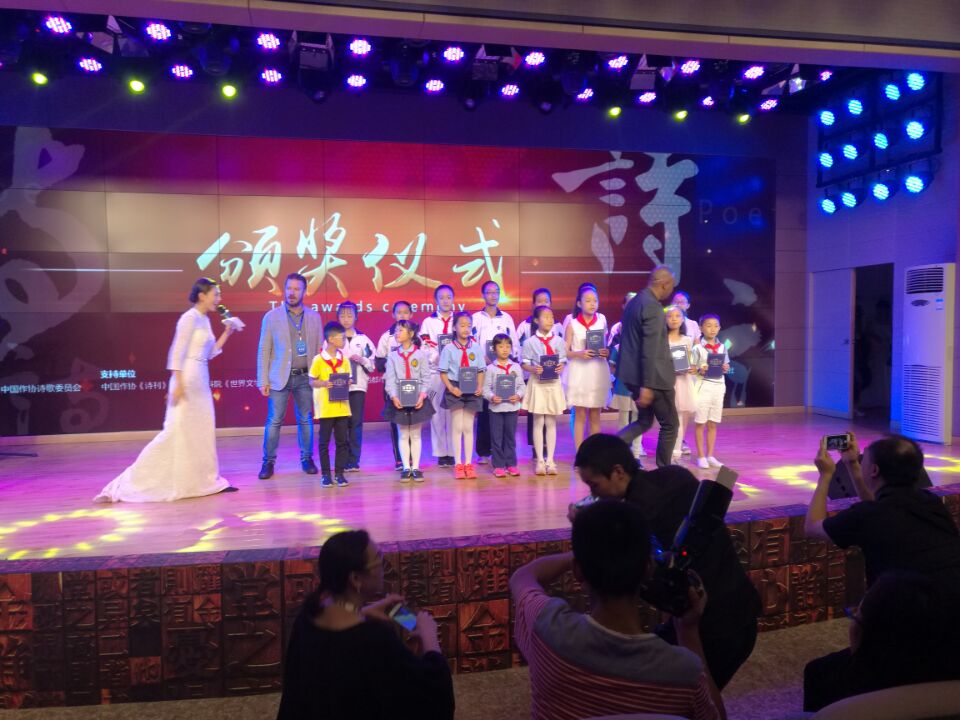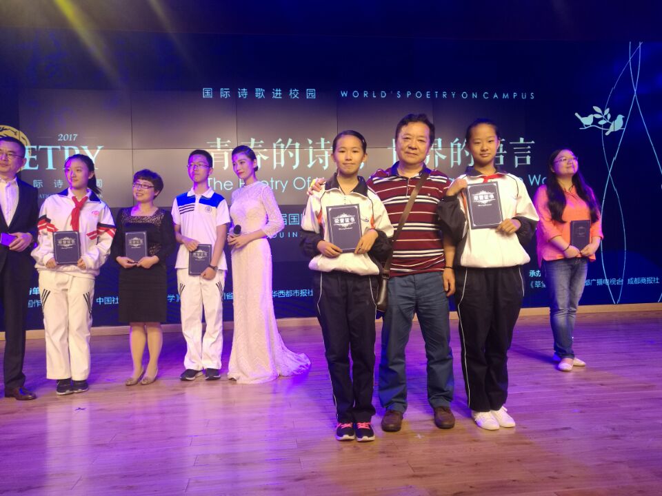 在吟诵诗歌的间隙,穿插了颁奖活动,中外嘉宾给获奖的个人和单位颁发了奖状。其中,我校荣获“最佳组织奖”,初二学生张婉怡《天府之国------成都》,初三学生刘亚西《成都邀请你》荣获个人优秀奖。
