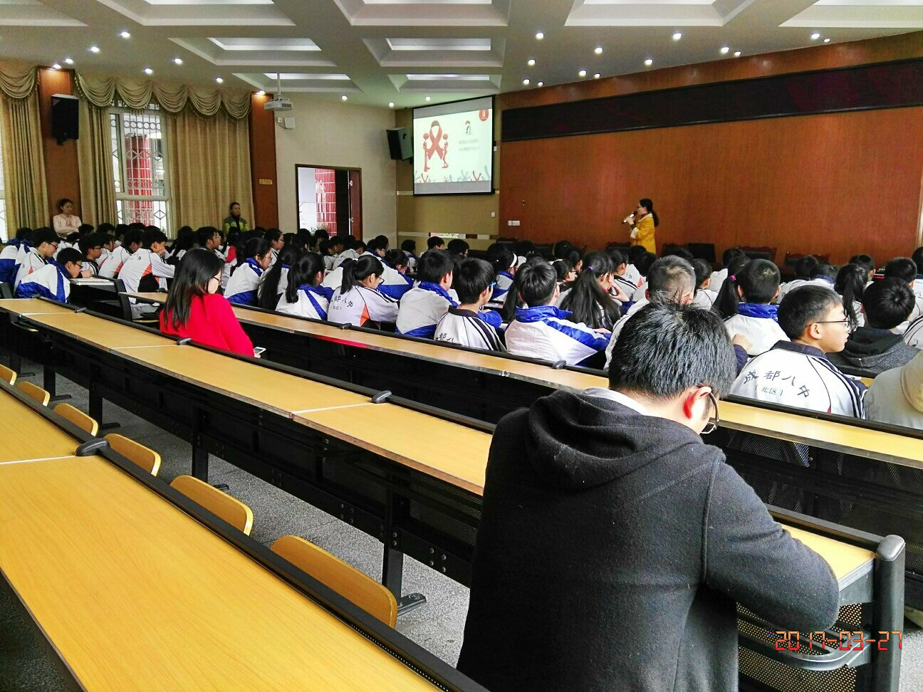 近日,我校组织9年级学生齐聚学校阶梯教室,举行了专题安全班会课《红丝带行动——预防艾滋》。这次讲座介绍了艾滋病科普知识,让学生明白了什么是艾滋?有哪些症状?观看了“一个艾滋病人的90天”、“艾滋难以治愈”等相关视频,了解了艾滋的成因、传播途径,尤其是明确了如何有效预防艾滋的知识。