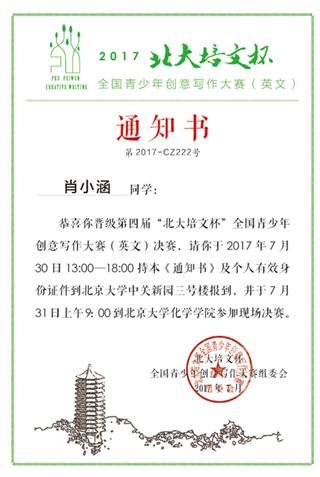 我校学生肖小涵获奖了